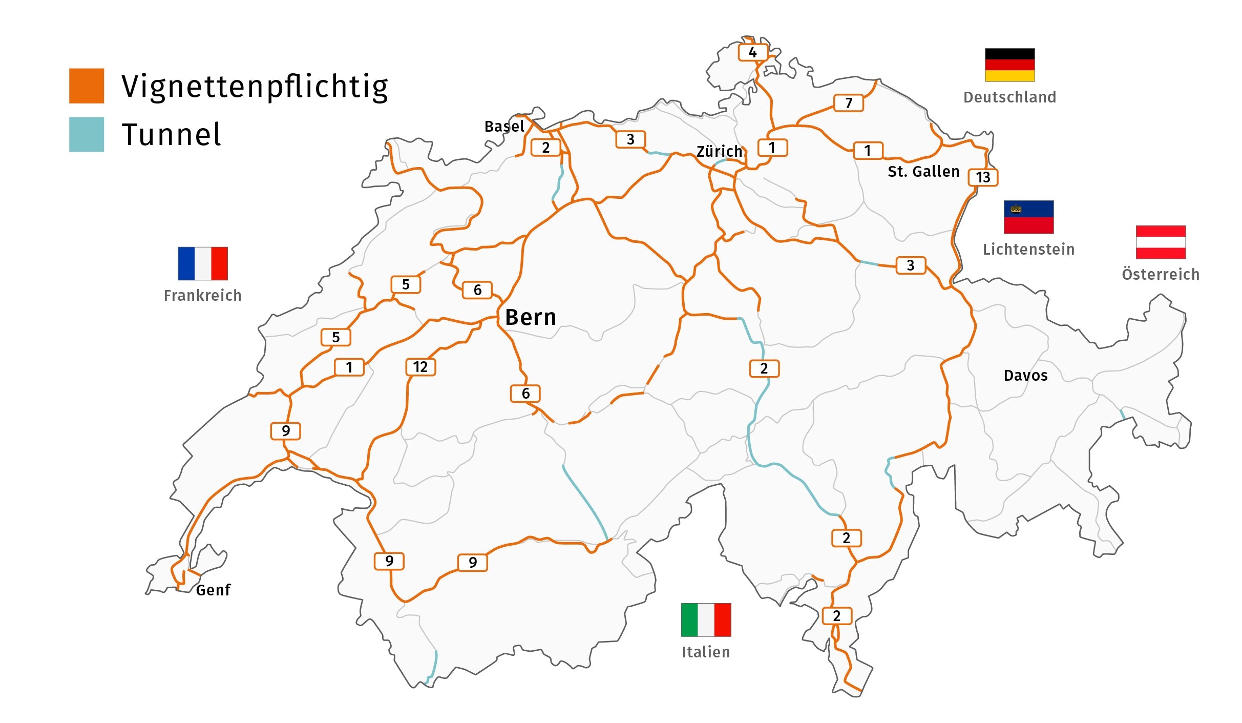 Digitālā vinjete ir derīga visā valstī un visā Šveicē. Tomēr dažiem tuneļiem ir jāmaksā papildu nodevas. Tāpēc iesakām iepriekš pārbaudīt precīzu maršrutu, pa kuru brauksiet, un pēc tam pārbaudīt, vai ir jāmaksā papildu nodeva.
